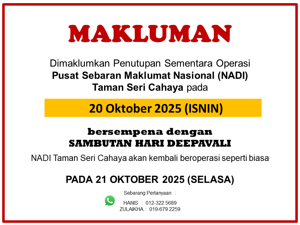 MAKLUMAN PENTING 📢 Dimaklumkan bahawa Pusat Sebaran Maklumat Nasional (NADI) Taman Seri Cahaya masih ditutup sementara pada hari ini:🗓 20 September 2025 🔧 Sempena Proses Pengubahsuaian NADI masih belum selesai Operasi akan kembali berjalan seperti biasa pada:🗓 21 September 2025 […]