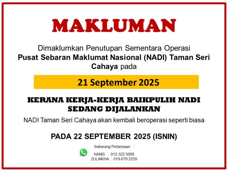 MAKLUMAN PENTING 📢 Dimaklumkan bahawa Pusat Sebaran Maklumat Nasional (NADI) Taman Seri Cahaya masih ditutup sementara pada hari ini:🗓 20 September 2025 🔧 Sempena Proses Pengubahsuaian NADI masih belum selesai Operasi akan kembali berjalan seperti biasa pada:🗓 21 September 2025 […]