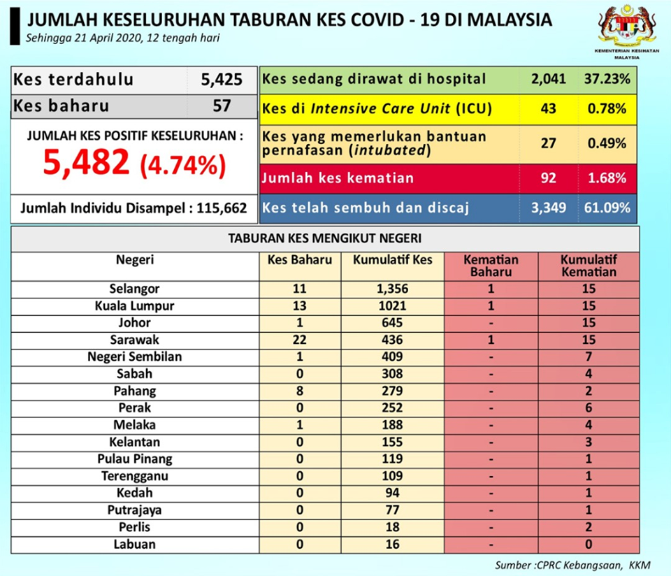 Taburan kes termasuk kes baharu, kumulatif dan kematian sehingga 12 tengah hari, 21 April 2020.
